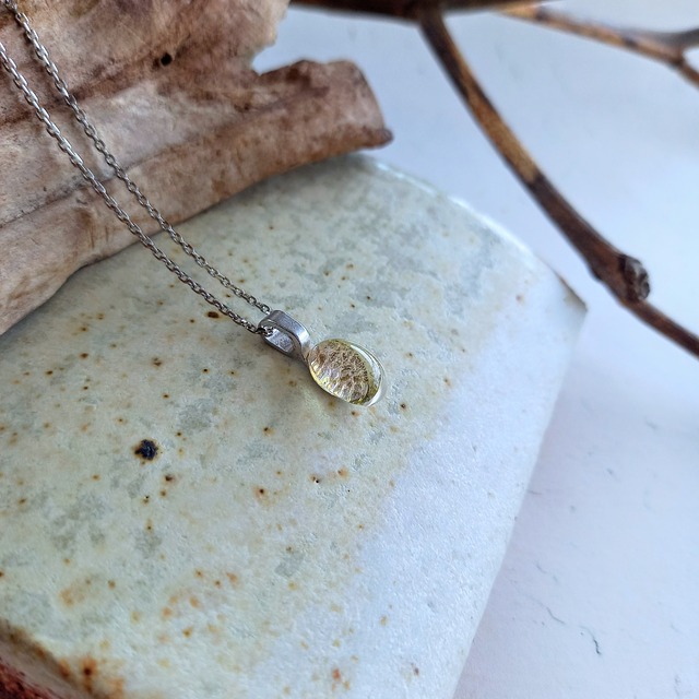 波も穏やかな南の島。 一面に広がる透き通るブルーの海。 そんな海をイメージしたシーグラスネックレスを作りました。 シーグラスをご存じでしょうか。 海に落ちたガラスが、長い間海を旅することで削られ、丸くなり、宝石のように輝いて浜辺に打ち上げられるのです。 シーグラスは乾くと曇りガラスようになりますが、今回はガラスフュージングという技法で表面を溶かし透明度を上げました。 純度100%のシーグラスのため変色の心配もございません。 まるで海のしずくをそのまま固めたような、美しい仕上がりになっています。 kinnimのシーグラスシリーズは全て私が海で拾い集めました。 このシーグラスを拾った砂浜は太平洋に面しており、海外から世界一広い海原を渡ってきたのかと想像がふくらみます。 シーグラスをいかした加工のため内部にはインクルージョン(内包物)がございます。 ぜひ光に透かしてみてください。 海の波しぶきを思わせる陰影が現れ、小さな海のかけらを思わせるのです。 シーグラスはカジュアルなイメージが強いですが、こちらはシンプルで大人っぽいデザインため、様々なシーンでお使い頂けます。 【素材】 チェーン:サージカルステンレス トップ:シーグラス 【サイズ】 シーグラス:9×9mm チェーン(シルバー):43cm ______________________ ■ お手入れ/取り扱い注意事項 ご使用後は柔らかい布で優しく拭いてください。 直射日光、高温多湿を避け、ケース等で保管ください。 金属アレルギー対応金具ではございますが、全ての方にアレルギー反応が出ないことを保証するものではございませんのでご注意ください。 ■ 発送・注文に関する情報や注意事項 ご注文後、1〜3営業日での発送を予定しております。(土日休日を除く) 発送先住所のご確認をお願い致します。 万が一、商品に不具合があった場合は、到着後7日以内にご連絡ください。 ■ その他の情報や注意事項 シーグラスを使用していますので、色合いや形状に個体差があります。 商品の魅力としてお楽しみ頂ければ幸いです。 お問い合わせは、ショップのお問い合わせフォームよりご連絡ください。